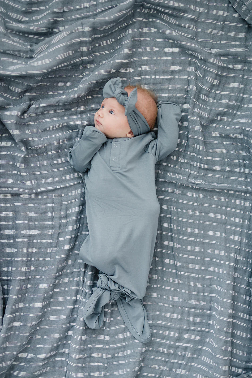 This is a one size head wrap that will fit size newborn and up. It is made out of a soft Bamboo Rayon. They are tied in a simple square knot making it easy to resize on your little ones head. We love how soft they are and the neutral designs they come in. They each have matching stretch knot gowns and swaddles in our shop.