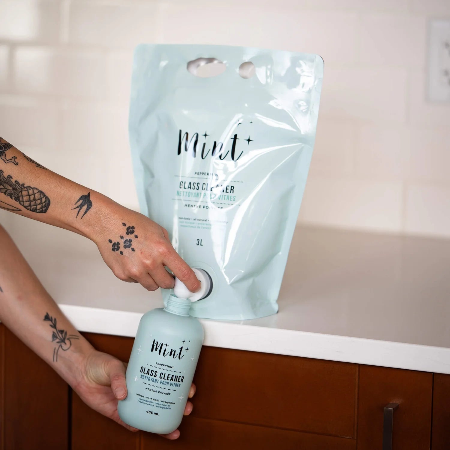 Our all-natural Glass Cleaner is specially formulated to leave your surfaces streak-free and gleaming. Safe for use on glass, stainless steel, faucets, and mirrors, it gives a polished shine and can even be used as an after-shower spray to prevent mildew and soap scum buildup. Infused with mint essential oil, this 456ml plastic bottle is reusable and recyclable, making it both effective and eco-friendly.