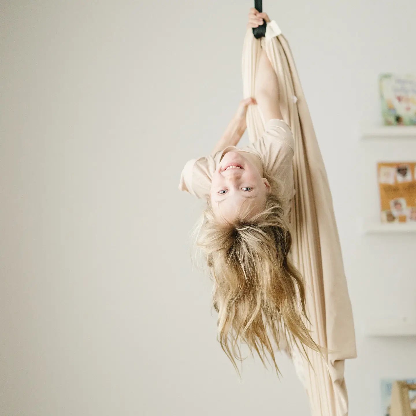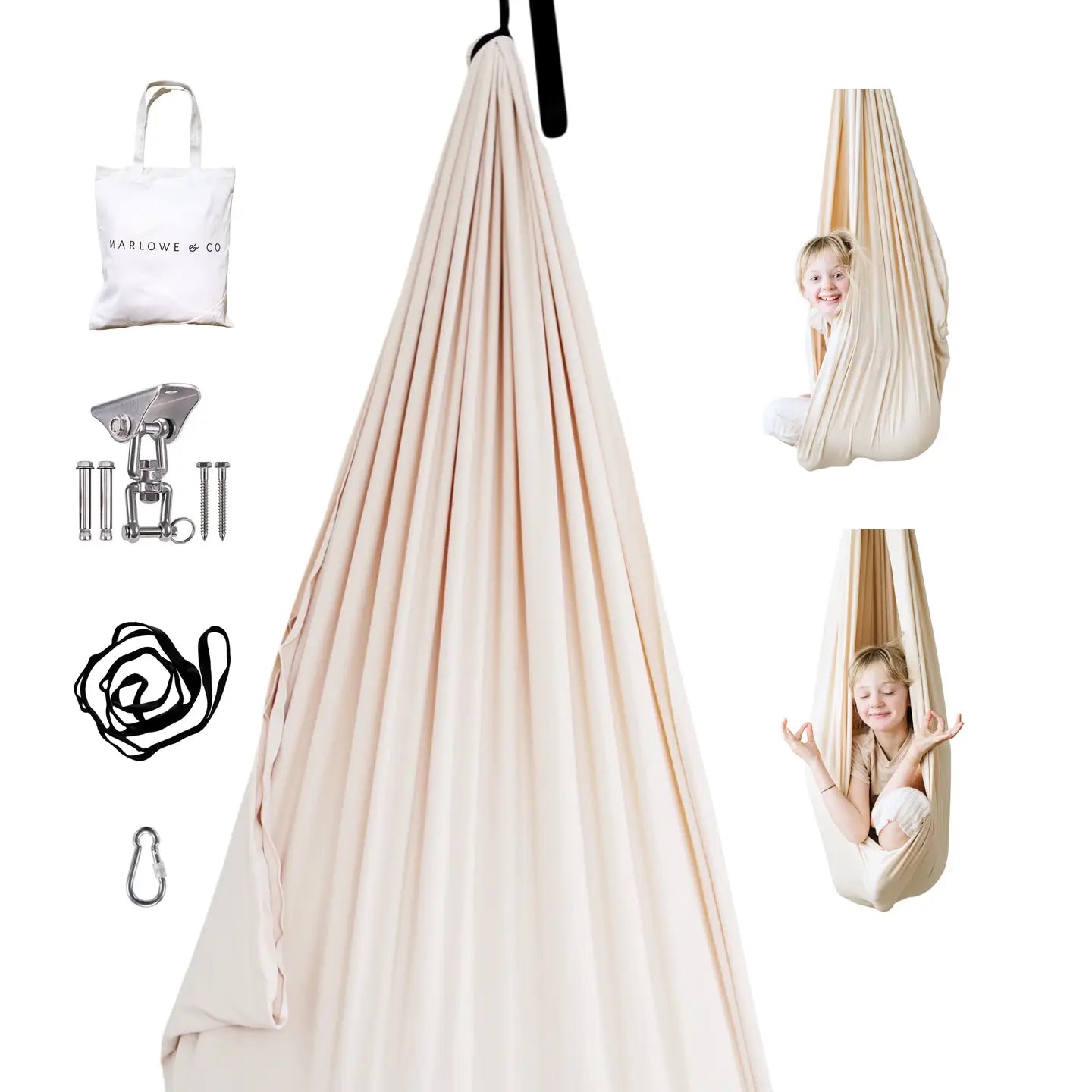 Our best selling double layer sensory swing is made from a soft premium blend of 95% Cotton + 5% Spandex that can hold up to 200 lbs. How does it work? Vestibular swings promote coordination and balance, strengthen muscles, and improve motor skills. The compression of the swing helps your child feel secure similar to getting a hug promoting feelings of security and relaxation, while the swinging motion provides sensory input, endless possible positions, and indoor fun! Our swings measure 35 in x 43 in when laying flat and are designed to be wider than other brands which makes it suitable for older children and adults to enjoy. We chose only the highest quality cotton/spandex fabric to craft our swings. Features: ~ Material: 95% Cotton + 5% Spandex ~ Maximum weight: 200 lbs ~ Suitable for children and adults ~ Pre-attached daisy chain and Hardware included ~ Assembly required
