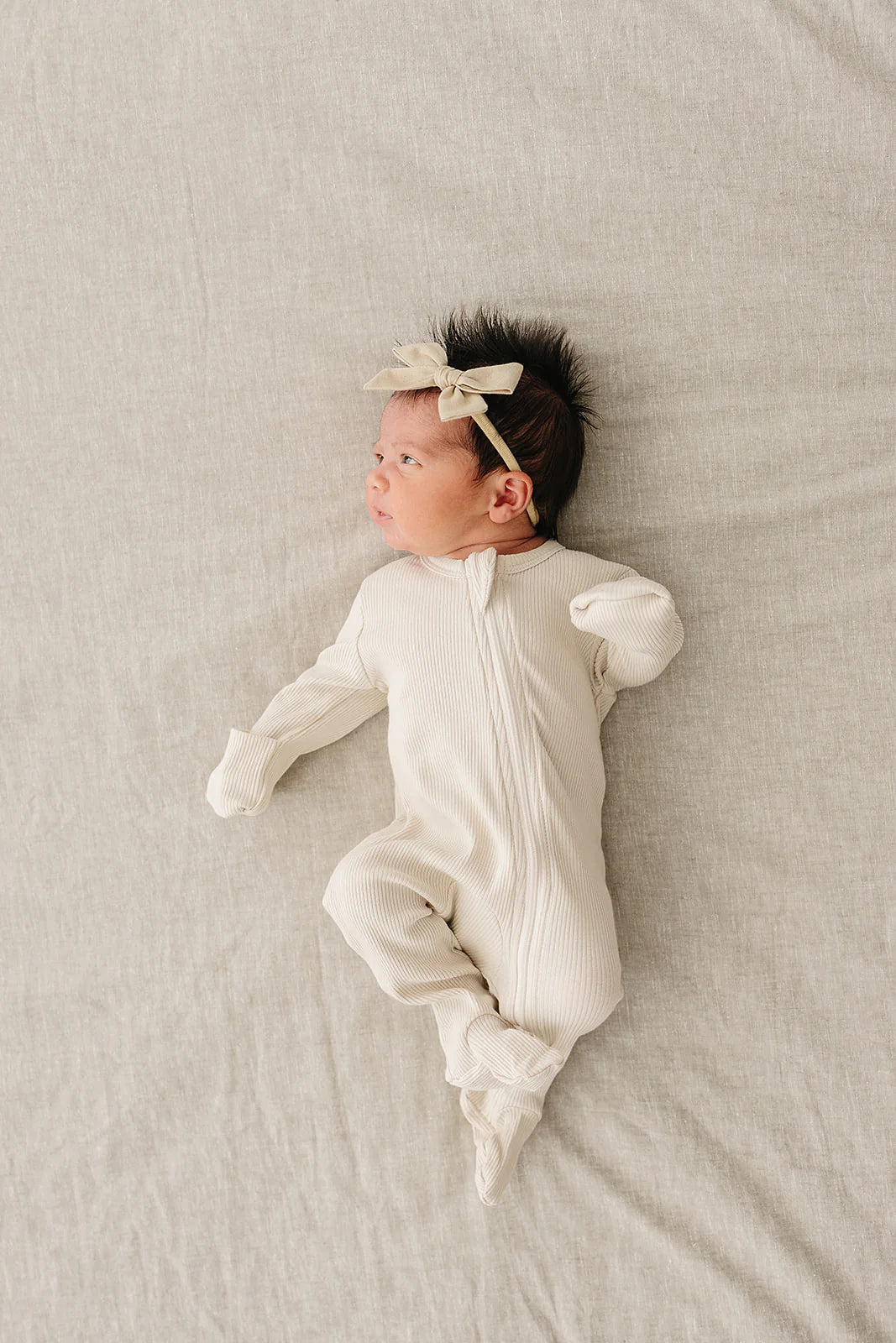These are our new ribbed footed baby pajamas. They are made out of an Organic Cotton ribbed fabric and are done up with a zipper. This features a double zipper that zips from the top and bottom meant for easy diaper changes. We have a lot of gender neutral options making them great for all babies. The functionality of these zippers make them a baby essential.